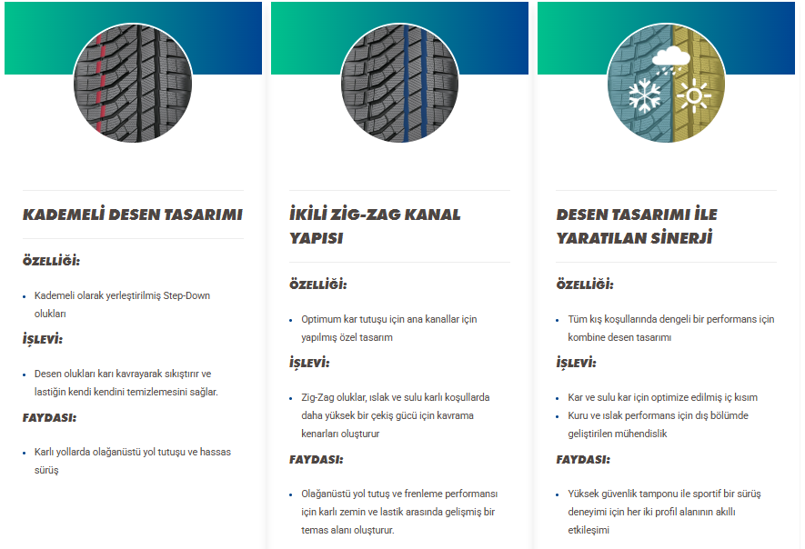 karlı ve ıslak zemin yol tutuş performansları arasında mükemmel bir denge sağlar ve her türlü kış koşulunun üstesinden gelir.